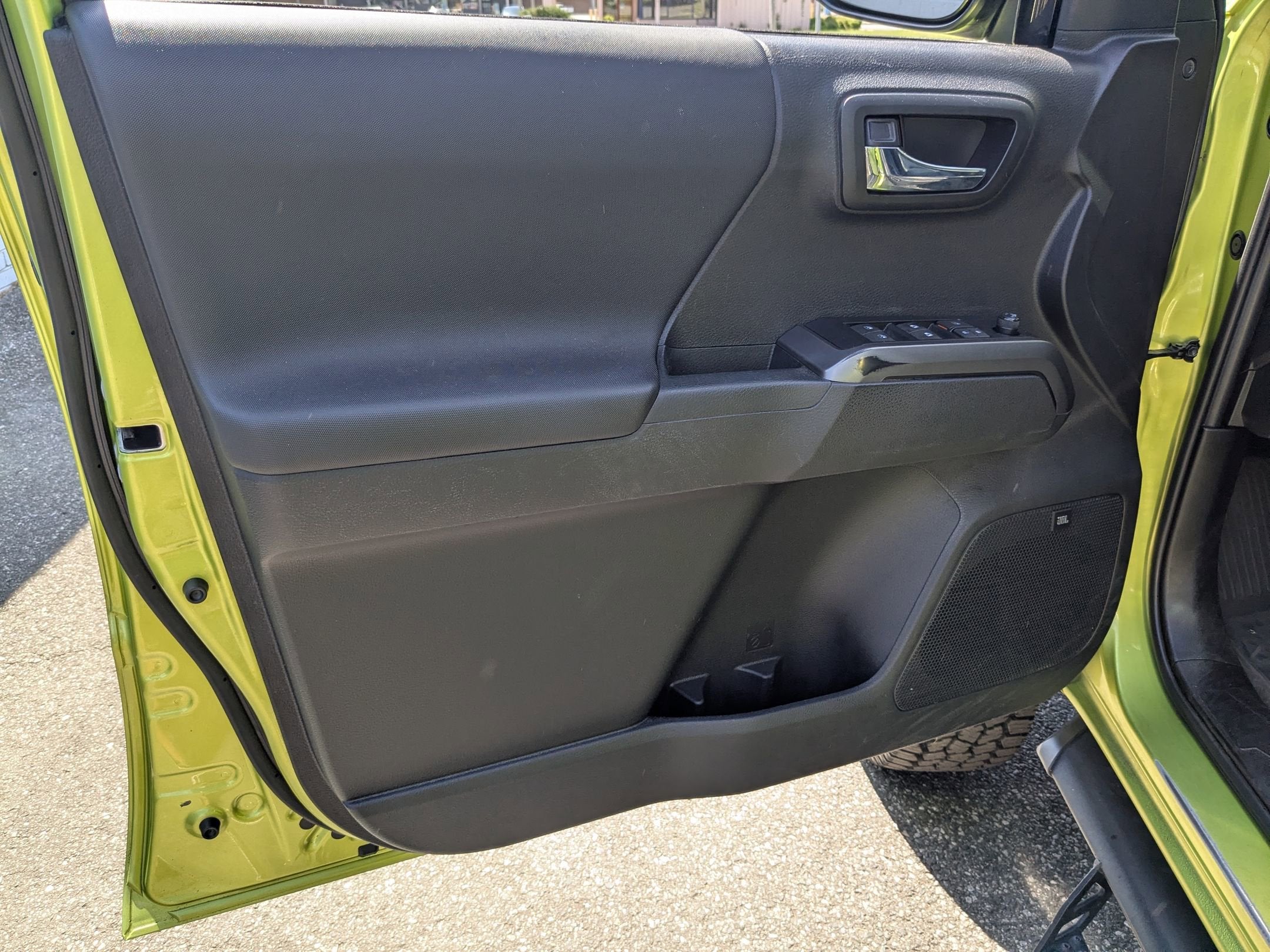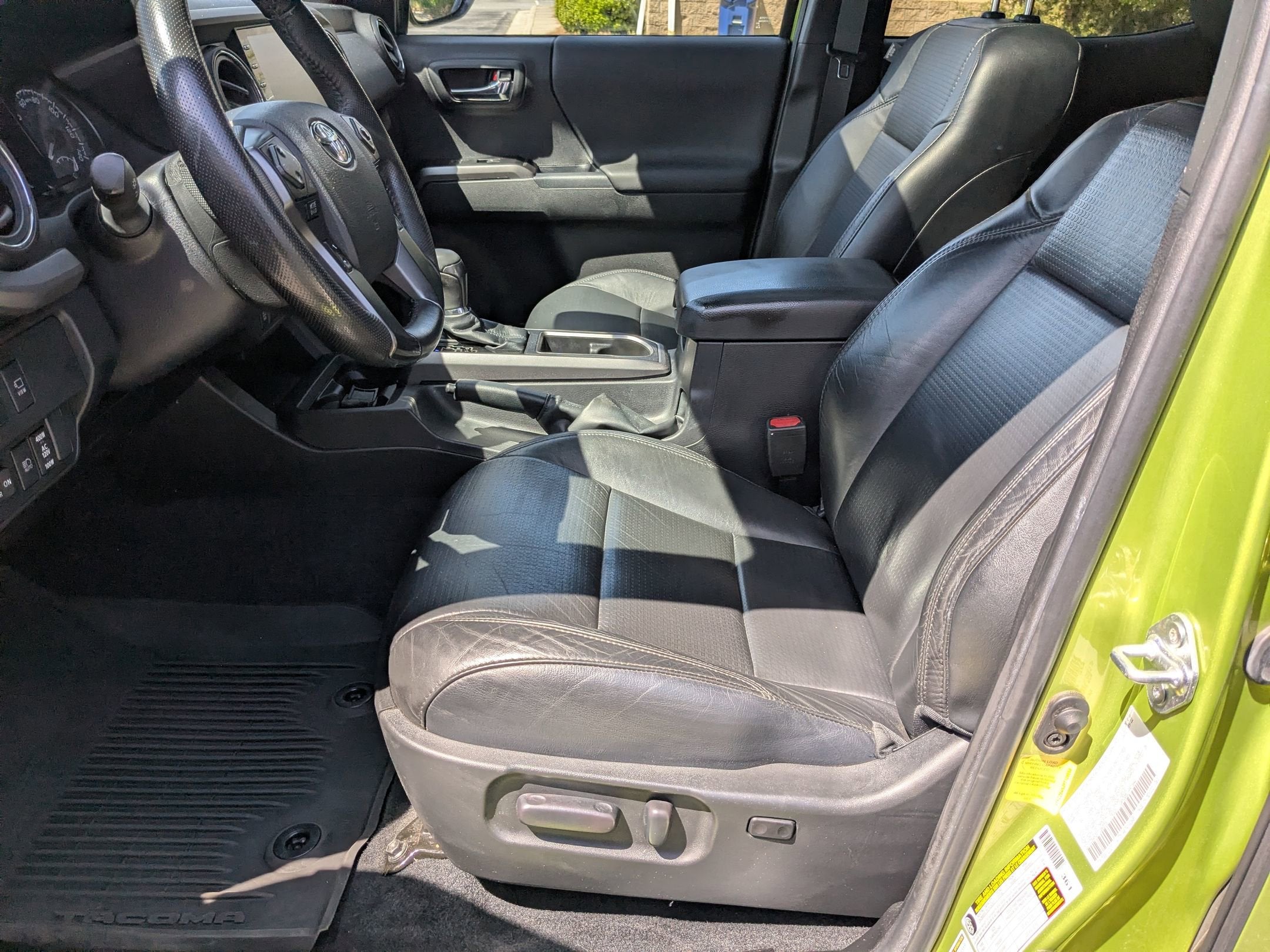 Electric Lime 2023 Toyota Tacoma TRD Sport V6 4WD, ABS brakes, Air Conditioning, AM/FM radio: SiriusXM, Anti-whiplash front head restraints, Apple CarPlay/Android Auto, Auto High-beam Headlights, Automatic temperature control, Axle Ratio: 3.91, Brake assist, Bumpers: body-color, Driver door bin, Dual front impact airbags, Dual front side impact airbags, Electronic Stability Control, Emergency communication system: Safety Connect (1-year trial), Front anti-roll bar, Front Bucket Seats, Front Center Armrest, Front dual zone A/C, Front reading lights, Front wheel independent suspension, Heated door mirrors, Illuminated entry, Knee airbag, Low tire pressure warning, Occupant sensing airbag, Outside temperature display, Overhead airbag, Overhead console, Passenger door bin, Power door mirrors, Power steering, Power windows, Rear step bumper, Speed control, Speed-sensing steering, Split folding rear seat, Steering wheel mounted audio controls, Tachometer, Telescoping steering wheel, Tilt steering wheel, Traction control, Variably intermittent wipers, 4WD. TRD Sport V6